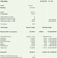 • Great investment opportunity since the ROI in the worst and most unlikely scenario would be 4 years (considering only 50% occupancy and included  the lowest market rates per room or villa rental). The normal thing would be to amortize in 2 years and ensuring  benefits that no financial product could improve in profitability in the next 10 years.